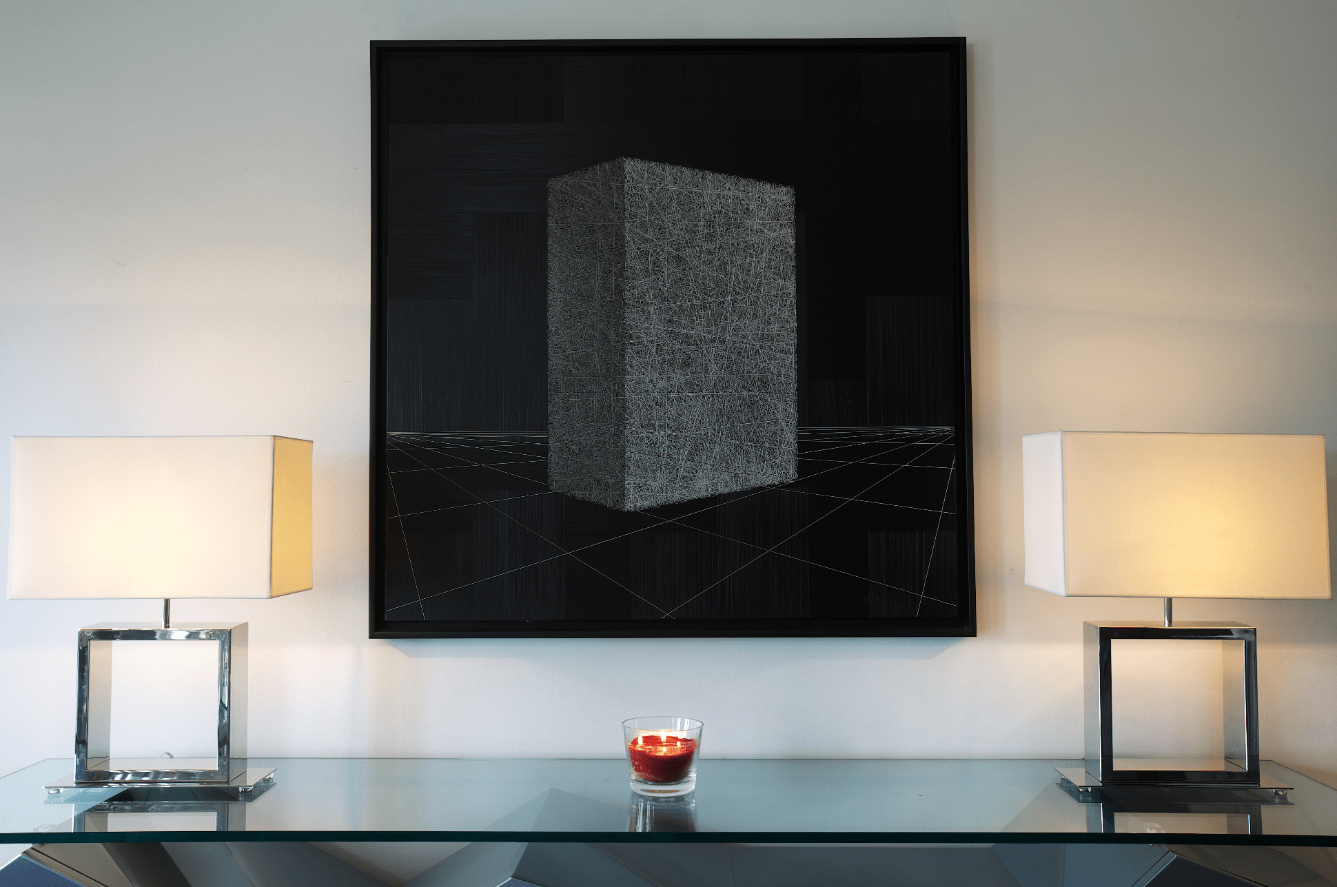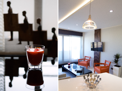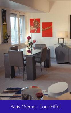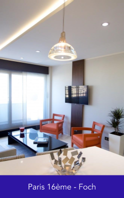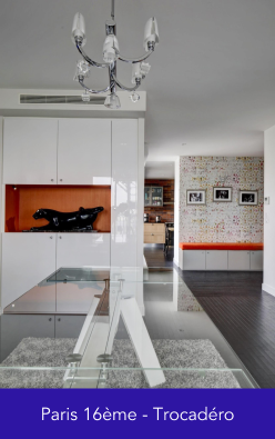 La table en quartz blanc est l’élément central de cet appartement. Elle sépare élégamment la cuisine italienne en verre laqué blanc du salon. Les tabourets sont recouverts d’un Tissu Rubelli .La suspension Galileo un bijou fait de plaques de verres découpés au laser. Les panneaux japonais réalisés à partir d’un magnifique tissu Dedar habillent les fenêtres. La terrasse a elle aussi subit une métamorphose; bois, éclairage et grande jarre rétro éclairées l’habillent. Dans la chambre un lampadaire Arturo Alvarez diffuse une luminaire douce et tamisée.