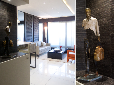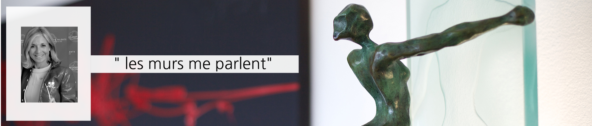 L’entrée, tel un écrin aux couleurs sombres, tapissée d’un revêtement mural façon anguille Elitis souligne cette magnifique sculpture Catalano.