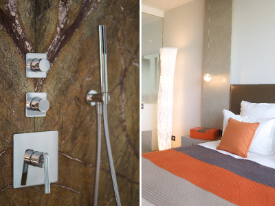 Dans la douche un marbre d’Inde posé à livre ouvert, robinetterie Fantini, plafond de douche avec chromothérapie Antonio Lupi.